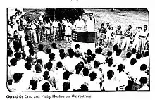 According to the book written by Kamarudin Jaffar, Dr. Burhanuddin Al Helmy: Malay and Islamic politics, Dr Burhanuddin has led the Malayan delegation in this conference. The presence of Dr. Burhanuddin, who holds the position of PKMM Advisor, has opened the opportunity for him to meet and discuss movements against colonialism together with the independence leaders of Asian countries.[17] Based on the sources of information, several conclusions can be made that the flag of the Young Malay Union Association, nicknamed Sang Saka Malaya, was first designed in 1947, but its design was not the same as that carried by the participants in the Promise of Democracy.[15][16]