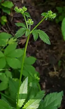 Sanicula canadensis, the Canadian blacksnakeroot,[1] is a native plant of North America and a member of family Apiaceae. It is biennial or perennial, and spreads primarily by seed.[2] It grows from 1 to 4.5 feet tall, and is found in mesic deciduous woodlands.[2] The whitish-green flowers with sepals longer than petals, appearing late spring or early summer and lasting for approximately three weeks, are green and bur-like.[2][3] The bur-like fruit each split into 2 seeds.[2][3] The species ranges throughout the eastern United States (excluding Maine), extending north into Quebec and Ontario, and west into Texas and Wyoming.