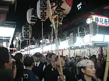 The festival's more publicized beginning starts on Friday when the Daigyōretsu (大行列, literally "large parade") is held.[9] This famous 19-block grand procession down Yanagi Street and Nakamise-dōri to Asakusa Shrine is an event that is used to energize the community. It is most known for its participants' lavish costumes, such as heron-hooded dancers, geisha and city officials wearing hakama (traditional Japanese clothing).[4] Musicians, performers and dancers also parade down the streets of Asakusa in traditional Japanese attire during the procession. In the evening, six mikoshi from the most central neighborhoods are sent parading through the streets on the shoulders of several dozen people.[4]