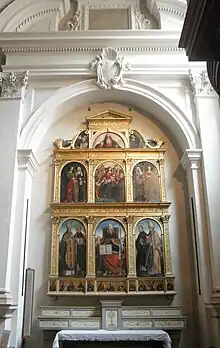 The church houses a large polyptych by Albertino Piazza.[1] The most important piece of art in the church, it was painted in 1520 which originally served as the Altarpiece. It was later relocated to a chapel on the first chapel of the right side of the aisles. The Tympanum shows a representation of the white dove between rays of light, a symbol of the Holy Spirit. The lunette shows a representation of God the Father imparting a blessing, flanked by scenes of annunciation.