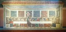 The best known component is the former refectory or dining hall of the convent, the Cenacolo of Sant'Apollonia now part of the Museums of the Commune of Florence, with entrance through a nondescript door near the corner of Via Ventisette Aprile and Reparata. The refectory harbors the well-conserved fresco, The Last Supper, by the Italian Renaissance artist Andrea del Castagno, along with the same artist's The Dead Christ Supported by Two Angels, originally above a door in the convent. The small museum also displays other fresco designs and works by Castagno, Neri di Bicci, Paolo Schiavo, and Raffaello da Montelupo.[1]