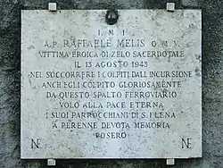 On the railway protective wall, close to the crossing between Via del Mandrione and via Casilina, a travertine cross commemorates the vicar Raffaele Melis, killed on 13 August 1943 by the second bombing of Rome – that struck the train of the former Rome–Fiuggi railway, full of people repatriating from Africa – while giving aid to wounded people.