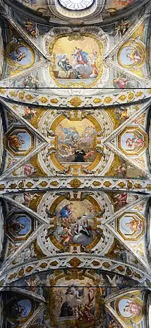 The present church of Santa Cristina and its adjacent monastery were erected at the site of some ruined building and a 10th-century parish church of San Siro.[1] This marked the eastern limit of Parma, and was the name attached to the gate of the town leading to Reggio. With the patronage of the Duchess Margherita Aldobrandini, widow of Ranuccio I Farnese, in a bull dated 22 January 1629, the Pope Urban VIII Barberini entrusted the complex to the Theatine order.[2] In 1649 the Theatines utilized a design which one of its members, Pietro Caracciolo, had developed for the church of San Vincenzo in Piacenza. Work continued until 1662 in the church, and the monastery till 1732. The Theatines remained here until 1805.
