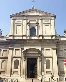 The original church at the site was founded in 1080, outside the walls of the village under the patronage of Pope Gregory VII. With the expansion of the town, the church was rebuilt in 1596 using designs of Pellegrino Tibaldi. One of the holy relics of the church is putatively a foot print of Christ, though made of Carrara marble, and, according to the tradition, dating back to the period of the Crusades.