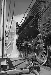 No. 2926 was among the last group of steam passenger locomotives built in 1944 by the Baldwin Locomotive Works in Eddystone (Philadelphia), Pennsylvania for the Santa Fe Railway.[3][4] This class of locomotives comprised the heaviest 4-8-4's built in the United States,[5] and among the largest. The railroad used the locomotive in both fast freight and passenger service, and it accumulated over one million miles of usage before its last revenue run on December 24, 1953. Equipped with the latest Timken roller-bearing tandem side-rods between 1946-1948, it was then approved for 110-mph speeds with the Santa Fe's crack passenger trains: up from 100-mph when delivered with its original side-rods.