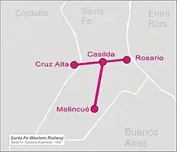 The terminus of this 5 ft 6 in (1,676 mm), broad gauge railway was (Rosario Oeste Santafesino Station), located in the southeast of the city of Rosario, within present-day Parque Urquiza. The line ran west along today's Pellegrini Avenue, and turned southwest along today's Godoy Avenue after Oroño Boulevard. It reached the town of Casilda, then known as "Colonia Candelaria". The railway was then extended towards the south of Córdoba Province, reaching Cruz Alta. A number of towns were founded on the way under the sponsorship of the company.[2]