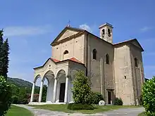The church stands atop a hill named Fortezza. While the church is from the 18th-century, the tall, slender, Romanesque-style stone bell-tower dates to the 11th century. The church ceiling was frescoed in 1740 by Carlo Borsetti. Other decorations were added in 1866 by Giovanni Francinetti. The main altar dates from 1777 and is surmounted by a 16th-century statue of the Virgin. The chapel of the Virgin of the Rosary has fifteen panels showing the Mysteries of the Rosary painted on copper (1663).[1]