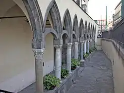 The particular shape, consisting of two asymmetric naves, derives from the fact that part of this church was once a tribunal during the Angevin Era. The church floor is lower than the street level, since this area was raised using soil from the nearby earthenworks of the Castel Nuovo in times of Charles V. Fragments of frescoes dating likely from 1352 are visible in the first bay to the left of the entrance, they once depicted the Triumph of Faith and Seven Sacraments, attributed to Roberto d'Oderisio. Some attributions, without any documentation, have been made for some of the images on the frescoes; they remain highly speculative.