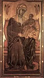 - Madonna del Marcovaldo (called Madonna del Bordone) by Coppo di Marcovaldo, signed and dated 1261, in Byzantine style and partially repainted by a pupil of Duccio. Its height of 7 feet 3 inches and its width of 4 feet foreshadow the late-thirteenth-century tendency for panel paintings to approach the scale of frescoes.[4]