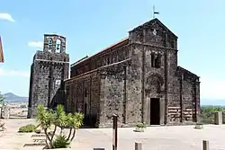 The church was built in dark basalt stone by Pisan workers (the island in the Middle Ages was under strong influence from the maritime Republic of Pisa). The façade is divided into five sectors and has a salient-shaped façade. In the middle is the portal, surmounted by a double mullioned window. The whole exterior of the edifice is characterized by false columns (lesenes) and Lombard bands; on the right are the remains of the square bell tower, which is missing the upper part.