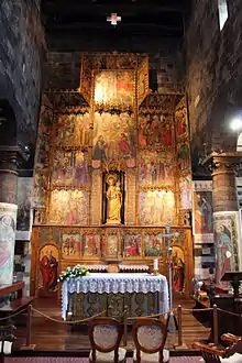 The church's columns have 17th-century paintings with Apostles and other Saints, while also present is a lesser retablo from the same school, a carved wooden pulpit and an epigraph celebrating the consecration of the church on May 7, 1107.