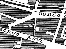 The Church was located in Rome, in the rione Borgo, in the homonymous alley ("vicolo della purità") that joined Borgo Nuovo to Borgo Sant'Angelo.[1] The alley was separated from Borgo Nuovo by an arch, placed almost in front of the balcony of the palazzo dei Convertendi, called by the church Arco della Purità.[1][2][3] On the top of the arch burned a perpetual lamp of artistic workmanship.[3]