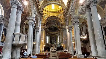 In 1646, during a pastoral visit by cardinal Stefano Durazzo, the cardinal arranged for additional renovations.[13][8] These renovations included the opening of three semicircular windows and an overhaul of the naves, with the replacement of the columns and the construction of the cupola, and were entrusted to the architect Daniele Casella.[10][8] With the transformation of the interior in Baroque style, the chapels and side altars were also enriched with paintings and sculptures by the confraternities and noble families.