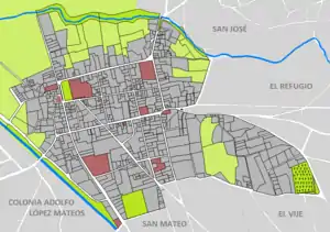 Since 1999, the city has been divided into 2 administrative Agricultural colonies (colonias ejidales in Spanish),[5] is urban sectors consolidated in the 20th century on communal land by farmer's son homes :