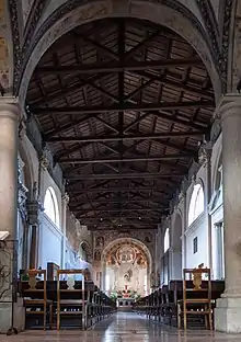 A church at this site was built in 1073 by Benedictine order Vallombrosan monks at the site of a previous religious temple.[1] The monks were patronized by Matilde di Canossa and Fulcone d'Este.[2] In 1117, the church was dedicated to the Holy Trinity, but that same year, an earthquake devastated the town and required extensive reconstruction for both the church and monastery. The church was made a parish church in 1336, it was enlarged in the 16th-century with the addition of an atrium and a Loggia delle Convertite.[3] By the 1441, the abbey was abandoned by the Vallombrosans, and by 1536, it had become a prison. During the 19th century, the church fell into ruin. The adjacent cloister was partially razed in the early 19th-century,[4] and during the 19th century, the church was attached to initially Salesian nuns, then the order of Stimatini. The cloisters and the Chapel of the House of Loreto were also destroyed in the aerial bombardment of April 6, 1945.