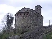 The actual building has a single nave three bays and an end apse. The sacristy was added to the apse during the Baroque period. The outside the apse is decorated with four lesene and twelve niches. Inside it preserves precious frescoes from the 11th century, featuring Christ and the four Evangelists, with 14 figures below representing the Apostles and saints.