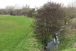 The Santry River rises at an elevation of c. 80m, in the semi-rural areas of Harristown and Dubber in the part of County Dublin now part of the local government area of Fingal, near the village of St. Margaret's and Dublin Airport. The lead branch can be found at the end of a small lane in the former Harristown Demesne, now cut off by new road development. The river then flows along to the south of Dublin Airport (from which some tributary streams enter it), near the new Dublin Bus Harristown depot. With the Dubber branch, it passes for most of its upper course out in the open, flowing through Sillogue Public Golf Course and the northern fringe of Ballymun; up to this point, the main channel is sometimes called Quinn's River.[1]