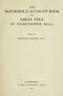 - Fell, Sarah. The Household Account Book of Sarah Fell, of Swarthmore Hall. Edited by Norman Penney. Cambridge: University Press, 1920.