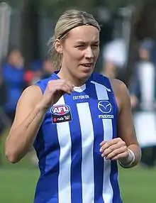 Sarah Wright (born 6 May 1994) is an Australian rules footballer playing for the North Melbourne Football Club in the AFL Women's (AFLW). Wright was drafted by North Melbourne with their second selection and thirty-second overall in the 2019 AFL Women's draft.[1] She made her debut against Melbourne at Casey Fields in the opening round of the 2020 season.[2]