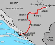 The Sarajevo–Ploče railway is a 194-kilometre (121-mile)[3] long railway in Bosnia and Herzegovina and Croatia. The line connects Sarajevo with Konjic, Mostar and Ploče. The route operates through the regions of Sarajevo Canton, Herzegovina-Neretva Canton and Dubrovnik-Neretva County. The route largely follows the route of the Neretva river.[3] Passenger services along the full length of line have been discontinued between 2013 and 2022, running only between Sarajevo and the town of Čapljina on the Bosnian-Croatian border.[4] International train service between Sarajevo and Ploče resumed on 1 July 2022, on weekends until September 1st, using Spanish-designed Talgo wagons.[5] This service also ran during the summer of 2023. The line is part of the pan-European corridor 5C from Budapest via Osijek and Sarajevo to Ploče. The section through Bosnia and Herzegovina is marked 11, and through Croatia M304.[6][7]