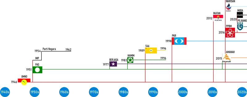 NASMA | 1985–1989 | The first Malay majority multi-racial party in the Peninsular since Parti Negara, it was embroiled in a leadership tussle within the first year, which triggered mass resignations. Entering the 1986 general Election in a weakened state, it did not capture any seat and faded away shortly after. |