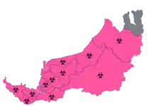 Since the first case was reported in Serian Division, further eight divisions including Betong, Kapit, Kuching, Miri, Samarahan, Sarikei, Sibu and Sri Aman have been declared as rabies infected areas.[23] One of the main causes of the spread to other divisions is resulted from an irresponsible dog owner taking a dog out from a rabies-infected area without movement permit from the state veterinary authority as discovered in late 2018 with a case of man who brought his dog to Limbang Division from Kuching.[24] From 1 July 2018 until 30 May 2019, the Sarawak government had declared 62 areas in 11 divisions as rabies infection areas with only Limbang Division free from the virus.[25][26]