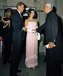Following Jacqueline Kennedy's goodwill tour of India and Pakistan in 1962, when she had brought back several saris with the intention to make them into dresses, for a short while the sari-inspired dress gained enough interest to inspire several designers including Wesley Tann to design dresses based from the sari.[6] Tann produced several dresses using saris including two which featured in The New York Times and became available at Henri Bendel; a turquoise and gold silk Chanel-style suit and a two-piece red and gold dress.[6] Joseph Horne Co. stocked several of Tann's sari-inspired dress.[6] In 1963, Oleg Cassini made Kennedy a light-pink, sari-inspired dress to wear at the opening of the Mona Lisa exhibition in Washington 8 January 1963.[7] It was based on a Howell Conant photograph of the yellow chiffon sari-inspired dress worn by Audrey Hepburn the previous year and was made using pink chiffon and decorated with porcelain beads and diamante.[7] On 3 June 1963, she wore it again when hosting a state dinner for Indian President Sarvepalli Radhakrishnan.[7][8] In 1967 Kennedy wore a sari-inspired Valentino gown to a dinner at the Chamcar Mon Palace in Phnom Penh, Cambodia.[9]