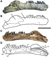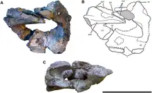 The holotype, MDT-PV 2, was found in the upper Lower Member of the Bajo Barreal Formation, dating from the Cenomanian to Turonian ages. It consists of an almost complete skull with lower jaws, articulated with the first seven vertebrae of the front neck. Several neck parts, among them the entire atlas and fourth neck vertebra, were too eroded to be salvaged. The specimen represents an elderly individual. It is one of the few titanosaurs for which skull material has been found.[3] Uniquely, at the side of the neck an elongated structure was discovered that was identified as an ossified tendon.[3]