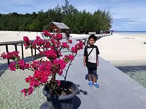 There are three other islands around Saronde, namely Bogisa, Mohinggito and Lampu island. Bogisa Island (9 hectares) has an elongated white sand beach, hills and forest with Saronde-like vegetation.[2] Mohinggito Island (30 hectares) is a marine conservation area that has a wide bay and is commonly used as a conscious mooring place for yachts visiting Saronde. Lampu Island (6 hectares) has a white sand beaches like Saronde. This island has flare lights and a government guardhouse. These islands are commonly visited by tourists and have become a package with Saronde tour visits.[3][4][5][6]