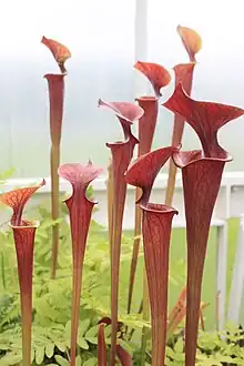 Sarracenia flava, the yellow pitcherplant,[2] is a carnivorous plant in the family Sarraceniaceae. Like all the Sarraceniaceae, it is native to the New World. Its range extends from southern Alabama, through Florida and Georgia, to the coastal plains of southern Virginia, North Carolina and South Carolina. Populations also exist in the Piedmont, Mendocino County, California[3] and mountains of North Carolina.