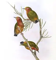 Sasia is a genus of birds in the woodpecker family Picidae, that are native to the Old World. They are very small, virtually tailless woodpeckers, with a crombec or nuthatch-like appearance and foraging habits. Their habitat is forest and secondary growth.[2]