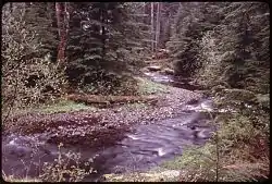 The Middle Fork Satsop River rises in the foothills of the Olympic Mountains and flows south, passing through steep gorges and canyons. At 35 miles (56 km) long it is the second longest tributary.[6] Shortly below the Middle Fork's confluence with Baker Creek its valley widens as the river approaches its confluence with the East Fork Satsop River.[15] Most of the watershed of the Middle Fork is second-growth forest used for timber production.[3]