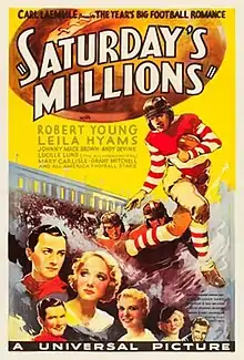 Saturday's Millions is a 1933 American pre-Code sports drama film directed by Edward Sedgwick and starring Robert Young, Andy Devine, Leila Hyams and Johnny Mack Brown.[1] [2] It was produced and distributed by Universal Pictures. The film is an adaptation of a story by Falkland Cary that was published in serial form in a national magazine.[3]