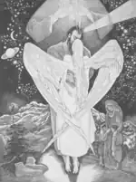 Raskin provided illustrations for a number of Hebrew texts such as Pirkei Avot: Sayings of the Fathers (1940), the Haggadah for Passover (1941), Tehilim. The Book of Psalms (1942), the Siddur (1945), Five Megiloth: Song of Songs, Ruth, Lamentations, Ecclesiastes, Esther (1949), the Kabbalah in Word and Image (1952), and other books such as Aron Hakodesh: Jewish Life And Lore (1955) and Between God and Man: Hebrew Rhapsody in 100 Drawings (1959). Aron Hakodesh (The Holy Ark) illustrates the life of a boy named Moishele from his Bar Mitzvah to marriage, to teaching his own children and in his old age, his grandchildren reflecting the idea of passing down traditional Jewish wisdom.[25][26] The last pages are about Israel and the Promised Land.[25] The book includes games, jokes, and folklore with about 150 illustrations with Yiddish and English descriptions.[25] Hebrew Rhapsody contained sections on "Moses the prophet supreme", "Samson the tragic hero", "Job the good man", "the Golem", "a wedding in town", "the Hasidim who serve God with joy" together with a set of drawings on the Land of Israel to mark the tenth anniversary of the State of Israel with the final pages describing his experience as an artist. Raskin described the book as a "Rhapsody in the medium of graphic art" and "An ode to my people, my wonderful 'old and young again' people." In 1960 Raskin published the book The New Face of Israel. In 1962, when Raskin was in his eighties, he published Personal surrealism, an illustrated book that included his thoughts on surrealism, dreams and his life in a mixture of Hebrew and English.