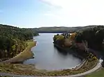 Saville Dam is an earthen embankment dam with masonry work on the eastern branch of the Farmington River in southwestern Barkhamsted, Connecticut and central Hartland, Connecticut, dividing the latter into two villages along its hilltops, East and West Hartland. The dam is 135 ft. (41 m) tall and 1,950 ft. (590 m) long and has an uncontrolled spillway on its western portion. It creates the Barkhamsted Reservoir which has a volume of 36.8 billion US gallons (139,000,000 m3) and is the primary water source for Hartford, Connecticut. Connecticut Route 318, also known as Saville Dam Road, crosses over the top of the dam.