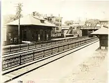 The Old Colony Railroad opened from Plymouth to South Boston in November 1845.[4] Savin Hill was a flag stop for South Braintree and Dorchester and Milton Branch trains by 1848.[5] A station building was located just north of the modern location by 1852.[6] The station was moved to its modern location just south of Savin Hill Avenue by 1874.[7] The Old Colony constructed a new brick station building in 1881.[8] It was located on the west side of the tracks (the inbound side, as the Old Colony had left-hand running until 1895), with a wooden building on the east side. After the line was quadruple-tracked, the station was served only by local trains on the outer tracks, while express trains used the inner tracks.[9][10]