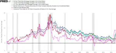 Financial historian Kenneth J. Robinson, in his explanation of the crisis published in 2000 by the Federal Deposit Insurance Corporation (FDIC), offers multiple reasons as to why the S&L crisis came to pass.[6] He identifies rising monetary inflation beginning in the late 1960s and increasing through the 1970s, caused by the federal government's domestic spending programs implemented by President Lyndon B. Johnson's "Great Society" programs and the federal government's mounting military expenses for the Vietnam War that continued into the late 1970s. The Federal Reserve's efforts to reduce rampant inflation of the late 1970s and early 1980s by raising interest rates brought on a recession in the early 1980s and the beginning of the S&L crisis. The Federal Reserve's policies to increase the discount rate charged to other banks, compared to the long-term fixed rates of loans the S&Ls had already made, practically ensured that most S&Ls would become insolvent very quickly. Deregulation of the S&L industry, combined with regulatory forbearance and fraud, worsened the crisis.[7]