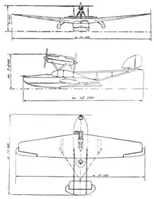 The earlier S.55 carried its empennage on a pair of open, flat, triangular girders constructed from tubes, one from each hull. The S.63 used a similar arrangement, allowing its single, unusually wide hull to be short. Its bottom had a shallow, concave V-section and a single step. Lateral stability on the water was provided by outward-leaning, V-bottomed floats mounted a little outside the centre-section. The original bomber version had defensive ring-mounted machine gun positions in the nose and behind the trailing edge. A forward entrance led to the pilots' side-by-side open cockpit, offset to the left and ahead of the wing leading edge.[1] The airliner conversion separated the pilots into two symmetrically positioned, enclosed cockpits[3] and introduced a windowed 3 m × 3 m (9 ft 10 in × 9 ft 10 in) passenger cabin behind the cockpit which seated ten. Behind it there was a space for luggage and a wireless operator's compartment with access to the engines.[1]