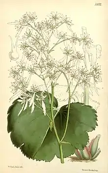 Saxifraga fortunei (齿瓣虎耳草),[1] the fortune saxifrage,[2] is a species of flowering plant in the family Saxifragaceae, native to China, Japan and Korea. Growing to just 40 cm (16 in) tall and broad, it is a shade-loving herbaceous perennial with large round fleshy leaves. Slender branched stalks bear panicles of small white starry flowers in summer. The two lower petals of each bloom are significantly longer than the others. Both the flowers and the leaves are sometimes flushed red or pink.
