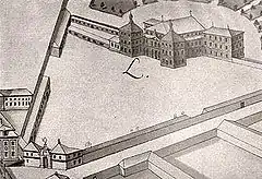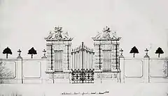 View of The Saxon Establishment from the north painted by Bernardo Bellotto il Canaletto of 1764 shows a main entrance to the palace from Wielopole with The Iron Gate and the 21 m-high garden gloriette, so-called Great Salon.[3]