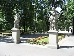 - Sandstone statues, a part of the rich collection of sculptures removed to Saint Petersburg after recapturing the city by Marshal Suvorov in 1794, and placed in the Summer Garden.[5] According to the 1745 plan of the Saxon Garden there were 70 postuments in the garden, and in 1797 there were only 37 sculptures left;[5] only 20 of them have been preserved until our times. Four of these sculptures were completely destroyed during the blowing up of the Saxon Palace in 1944, but they were later reconstructed.[5] Included are groups of sculptures, including Arithmetic, Astronomy, Bacchus, Flora, Geography, two sculptures identified as Glory, Instruct, Intelligence, Intellect, Justice, Medicine, Military Architecture, Painting, Poetry, Rationality, Science, Sculpture, Venus and Winter. They were generally made before 1745 by anonymous Warsaw sculptors under the direction of Johann Georg Plersch.[5]