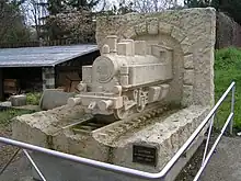 Monument for the Windbergbahn in the form of locomotive 98 014 carved out of sandstone near the Burgk Castle in Freital