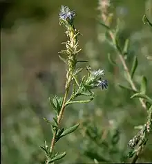 Scaevola browniana is a shrub which grows to a height of 1 m. The leaves lack stalks (sessile), are broadly obovate to oblong, usually entire, and have prominent, silky, axillary hairs. The leaf blades are 6–55 mm long and 2–17 mm wide. The inflorescences are terminal spikes which are up to 20 cm long. The bracts are narrowly lanceolate to narrowly elliptic, 4–25 mm long. The bracteoles are linear to ovate and 4–9 mm long. The blue to white corolla is 5–18 mm long, and has straight silky hairs on the outside, and is bearded on the inside. The ovary is incompletely 2-locular. The cup surrounding the stamen (indusium) is 1–2 mm wide and has hairs on both surfaces. The fruit is cylindrical, wrinkled and free from hair or down. It is 3–5 mm long and usually has one seed.[3]