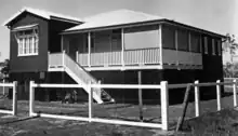 On Saturday 11 December 1937, a stump-capping ceremony took place for the Scarborough Methodist Church. The new church building was relocated from Deagon where it had served as a Sunday school hall.[28][29] It was officially opened on Sunday 9 January 1938 by Reverend J. A. Pratt.[30][31] On 28 August 1948 the foundation stone for a new Scarborough Methodist Church was laid by Reverend Hubert Hedley Trigge, the master of Kings College at the University of Queensland,[32] with the new church building being officially opening on 1 April 1950 by Trigge, with the former church building becoming the church hall.[29][33] The church is now used by the Scarborough Samoan Seventh-Day Adventist Church.[32][34]