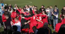 After a slow start to the following season, gaining just one point from the opening two league games, Scarborough Athletic then embarked upon a club record 27 match unbeaten league run which saw them surge to the top of the table. On 8 November 2008, Ryan Blott scored a club record five goals in a league match at Yorkshire Amateur. By the end of February 2009 the club had moved into a commanding lead at the top of the NCEL1 table and on 21 March 2009, following a 2–1 victory at Teversal, they were guaranteed promotion to the Northern Counties East League Premier Division (NCELP).[9] Three days later the club were confirmed as champions after a 3–0 win at home to Brighouse Town.[10][11]