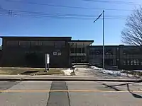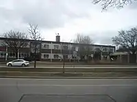 Until 1973, the board offices was also located at Scarborough Municipal Offices at 2100 Eglinton Avenue near Birchmount Road (built after World War II now demolished and site of parking lot). The new SBE administrative offices, located at 2466 Eglinton Avenue East (northside of Eglinton and west of Midland Avenue) and designed by architect Harold Carter, were built in 1954 and administrative operations were relocated in 1973. The former building was declared redundant by 1986 and was replaced by Rainbow Village condos in 1990.[32]