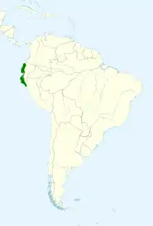 The nominate subspecies of scarlet-backed woodpecker is found from Colombia's Nariño Department south through western Ecuador to Guayas Province. V. c. major is found from El Oro and Loja provinces in Ecuador south into Peru as far as La Libertad Department. The species inhabits arid scrublands, dry deciduous woodland, semi-humid forest, dense riparian forest, and sometimes partially cleared areas. In elevation it mostly occurs from near sea level to 1,000 m (3,300 ft), less frequently to 1,500 m (4,900 ft) in Peru, and locally as high as 1,800 m (5,900 ft) in Ecuador.[7]