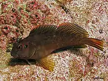 Scartichthys gigas, the giant blenny, is a species of combtooth blenny found in the eastern Pacific ocean, from Panama to northern Chile. Members of this species feed primarily off of plants (including benthic algae and weeds), crustaceans, and small mollusks and they themselves are seldom caught for human consumption, as their meat is tasteless. It is said that they can be made into a mildly narcotic soup, therefore their Spanish name borrachilla (drunk). This species reaches a length of 22.2 centimetres (8.7 in) SL.[2]