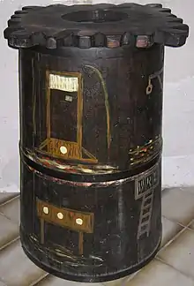 A Schandmantel or Schandtonne (German, "coat of shame" or "barrel of shame"), sometimes also Spanish coat, is a torture device which came into use in the 13th century. Schandmantels were fashioned from wood and sometimes lined with sheet metal. Victims were made to wear this device in public where they would be insulted, humiliated and have rotten vegetables thrown at them. The Schandmantel was mostly used as punishment for poachers and prostitutes.