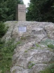 A marker of the Royal Saxon triangulation campaign of 1862 to 1890 stands on the summit of Schatzenstein. Beneath it, a commemorative plaque for the forester and poet Max Schreyer is mounted to the rock.